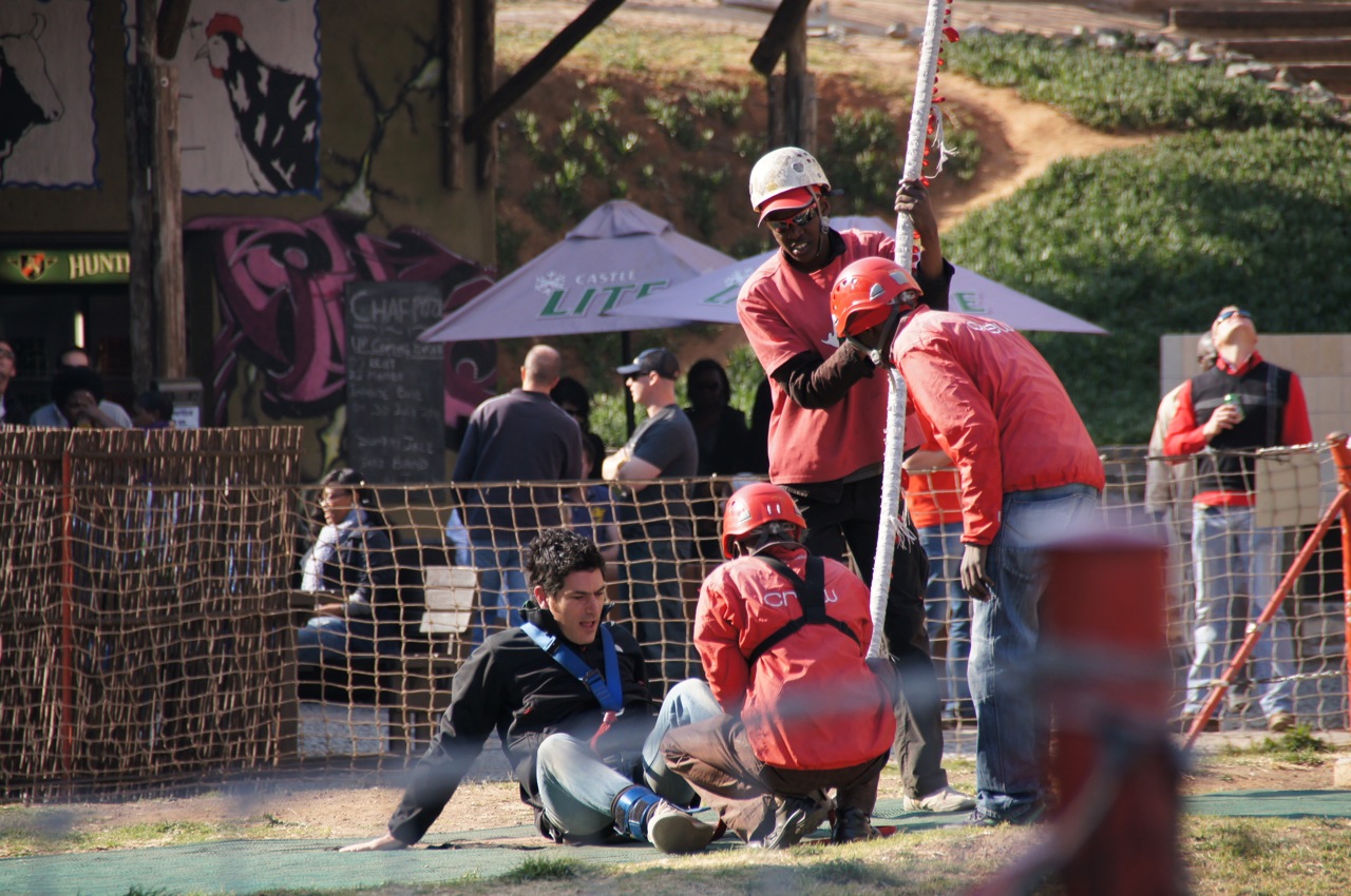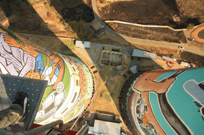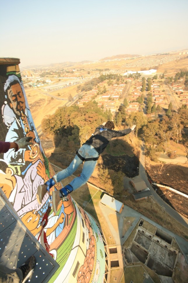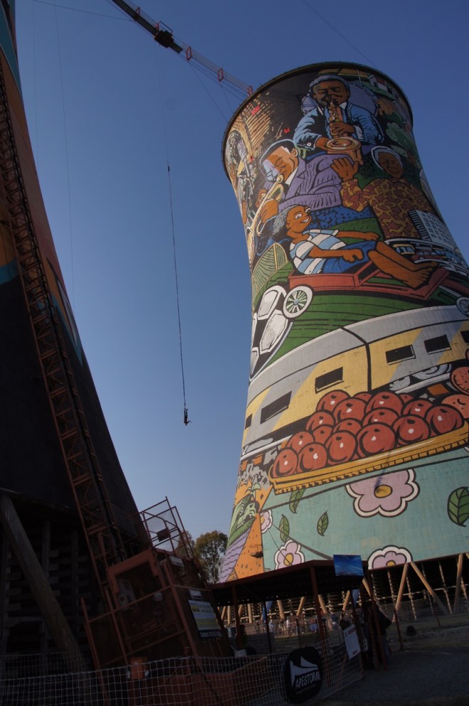 Resolvemos visitar o Soweto, mais precisamente Orlando Towers, uma antiga usina térmica que foi desativada e hoje é um parque radical. As antigas e gigantesca torres de resfriamento são usadas para base jump, alpinismo, rapel, escalada e bungee jump. Há ainda o aluguel de quadriciclos e paintball.