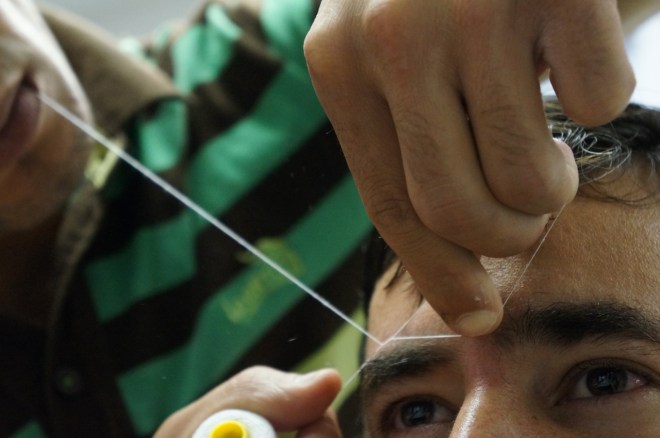 Enquanto esperava esfriar, pegou um carretel de costura e com uma habilidade impar, removeu parte da minha sobrancelha.