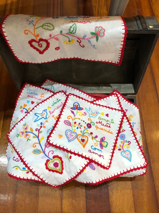 Você já ouviu falar em lenço dos namorados? Conta-se, por aqui, que antigamente, as mocinhas da região do Minho costumavam bordar seus próprios enxovais. Em meio a essa tarefa elas bordavam, às escondidas, alguns retalhos com mensagens de amor, saudade e alguns desenhos românticos. Os motivos mais comuns vistos nos lencinhos são pássaros, flores, corações e chaves. E eles são originalmente bem coloridos!